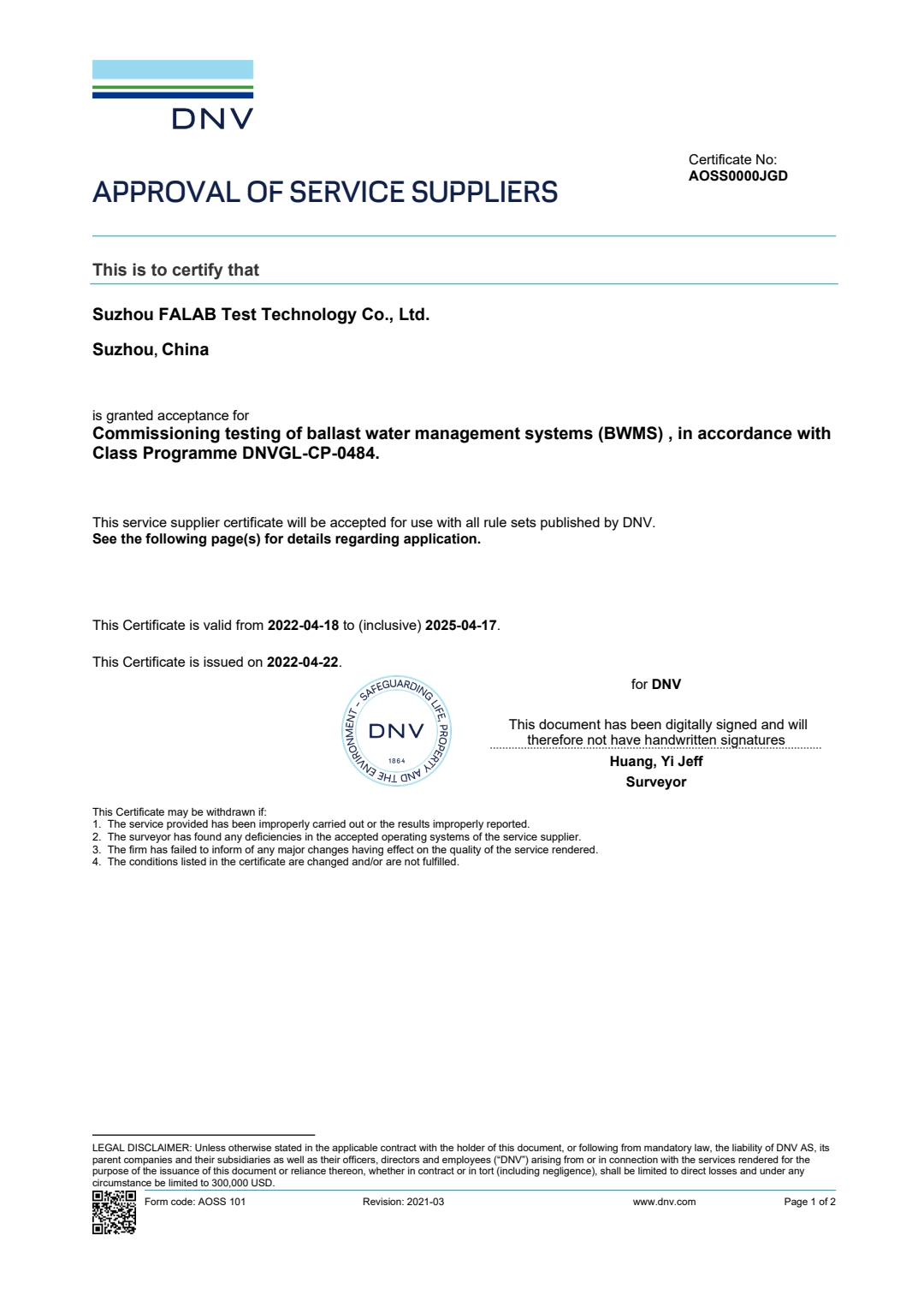 華碧(FALAB)壓載水檢測服務繼獲得美國船級社(ABS)資質認可后,于20224月又順利通過了挪威船級社(DNV)的資質審核。DNV的資質認可,標志著華碧(FALAB)檢測技術的專業性與報告的公正性獲得了國際標準的進一步肯定,提高了華碧(FALAB)在壓載水檢測領域的信心和服務能力。