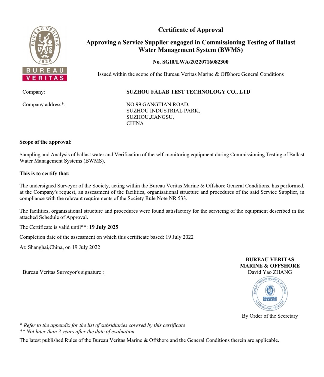 7月中旬,華碧(FALAB)通過了法國船級社(BV)的認證,成功取得其壓載水管理系統調試試驗(BWMS)資質認可,提升了華碧(FALAB)在壓載水檢測領域的服務能力。
