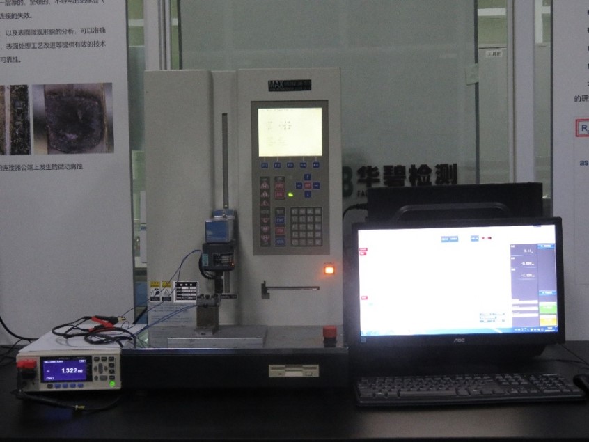 自主開發(fā)的正向力vs. 接觸電阻測試系統(tǒng):高精度測量系統(tǒng),配備了高精度微歐姆級電阻測試儀,位移分辨率為1微米的荷重測試儀 。可以完成各種端子的小位移正向力性能測試。