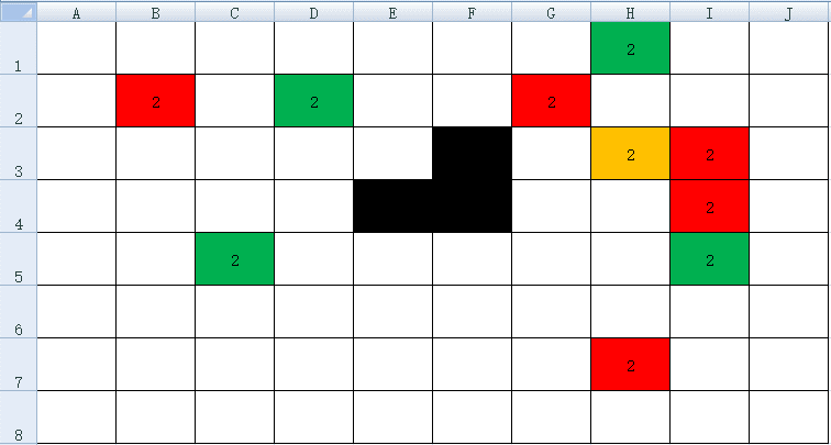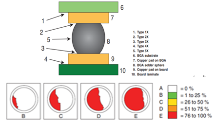 對于存在染色的器件,試驗(yàn)結(jié)果一般選用如下圖1所示的“染色點(diǎn)位分布”來呈現(xiàn)。其中,方格表示器件所有焊點(diǎn)的分布;黑色方格表示此處不存在焊點(diǎn);白色方格表示此處焊點(diǎn)無異常不存在染色;綠、黃、橙、紅方格表示此處焊點(diǎn)存在染色(不同顏色代表不同染色面積占比,如下圖2);方格內(nèi)數(shù)字(1、2、3、4、5)表示此處染色焊點(diǎn)的斷裂模式(如下圖2)