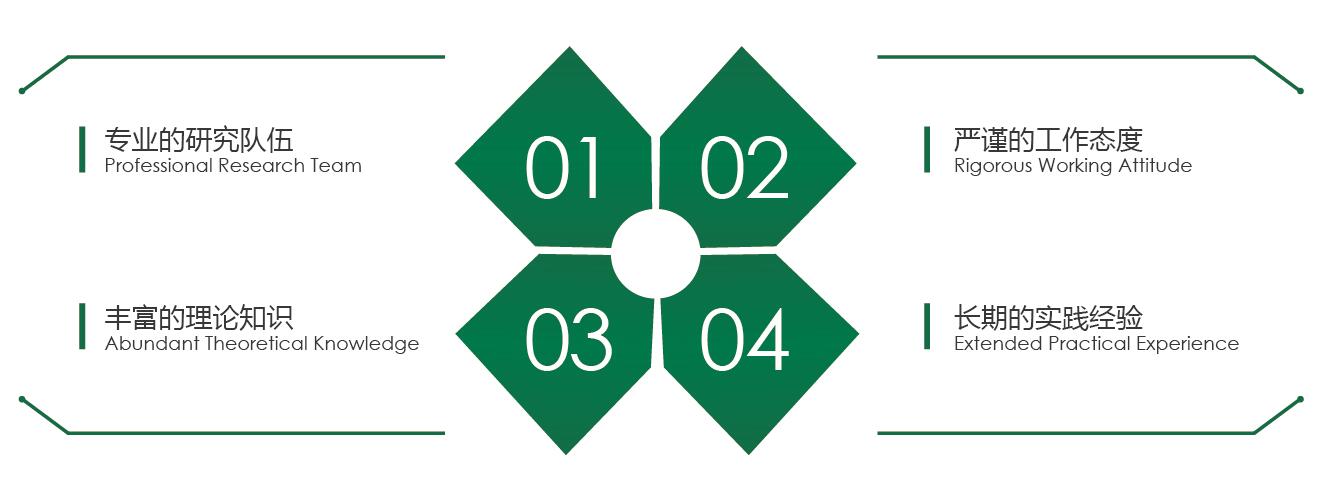 | 專業(yè)的研究隊伍 嚴(yán)謹(jǐn)?shù)墓ぷ鲬B(tài)度 豐富的理論知識 長期的實踐經(jīng)驗 | Professional Research Team Rigorous Working Attitude Abundant Theoretical Knowledge Extended Practical Experience |